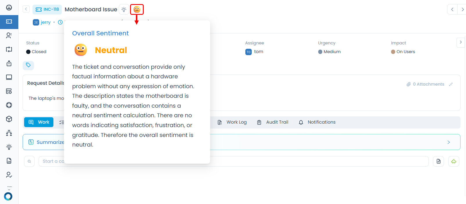 Spotting Escalation Risk Early: A ticket that started as Neutral turns Negative after two failed resolution attempts. The sentiment shift alerts the technician to escalate before the user contacts management directly.