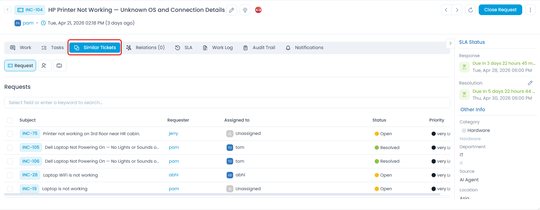 Proactive Resolution Before Ticket Creation: While filling in a new ticket, a technician notices the Similar Incident panel showing a matching record that is already being worked on. They coordinate with the assigned technician instead of duplicating the investigation.