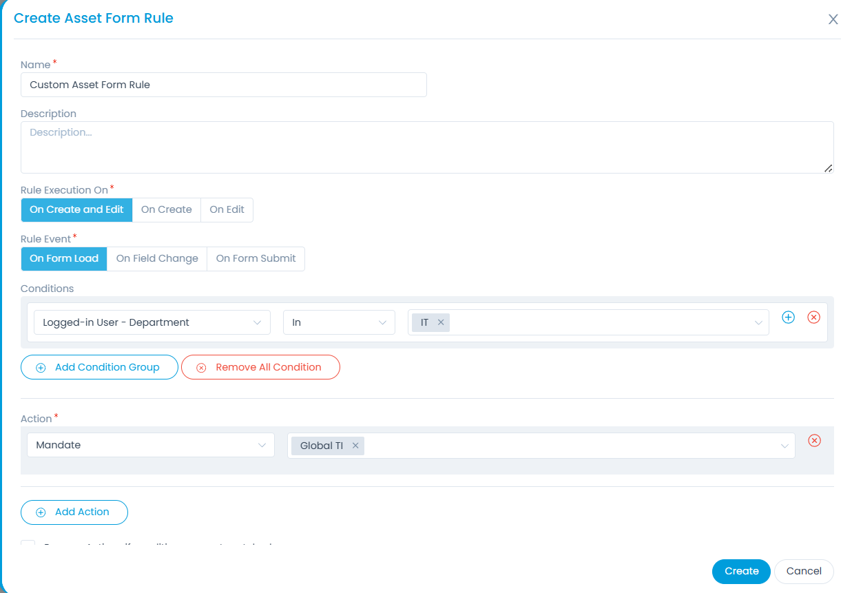 - Mandate: Makes the required field mandatory on the Asset Form when the conditions of the form rule match.