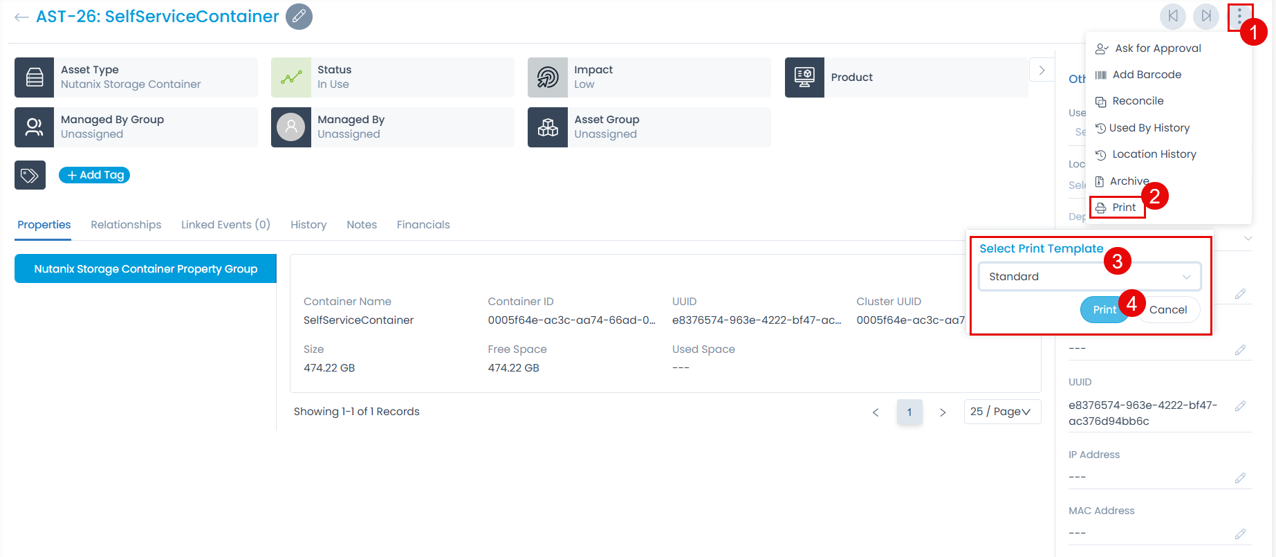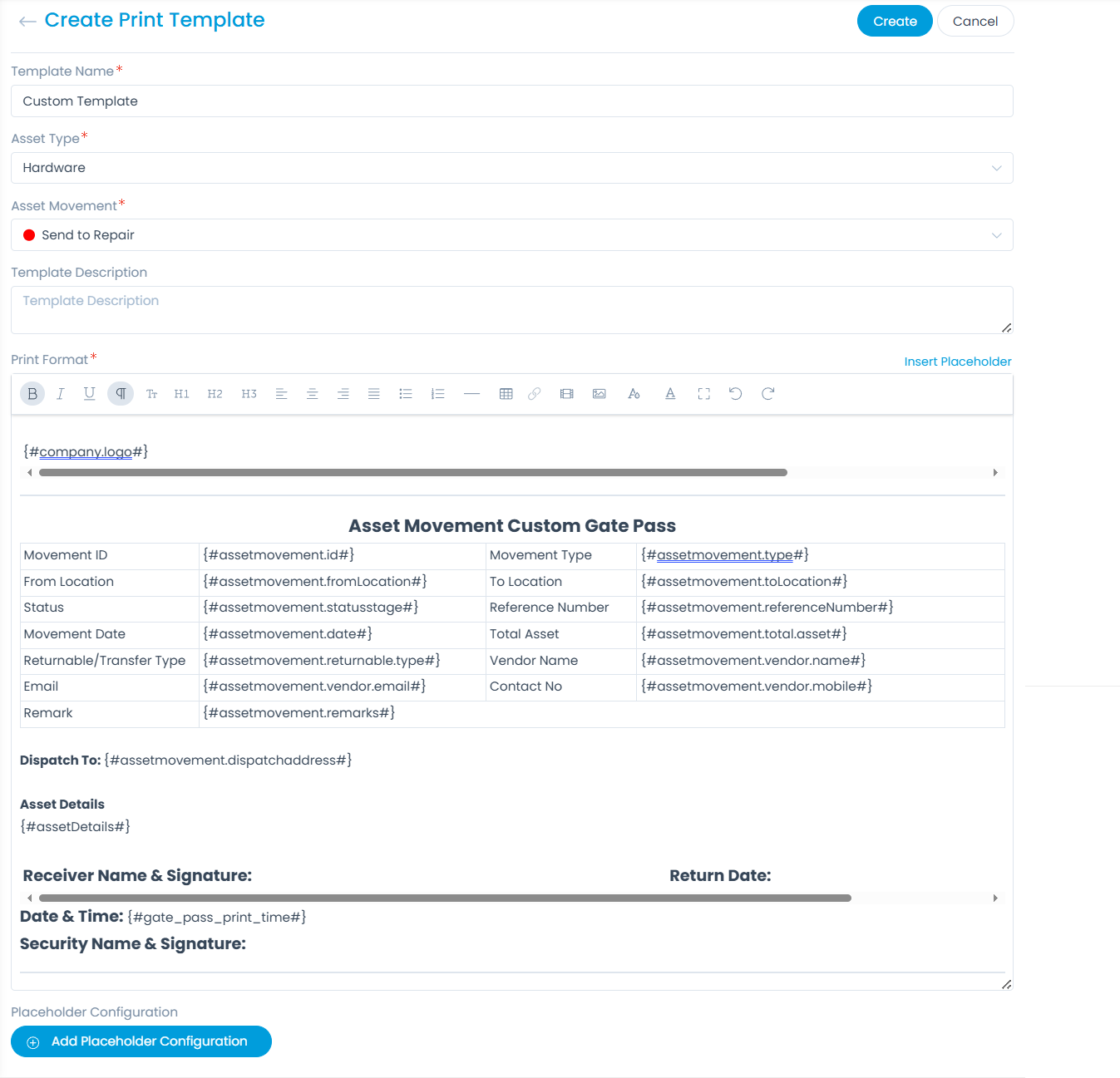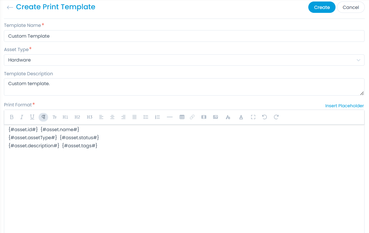 | Print Format | Create the format you want to use as a template for printing asset details. You can also use placeholders to include the required details. |