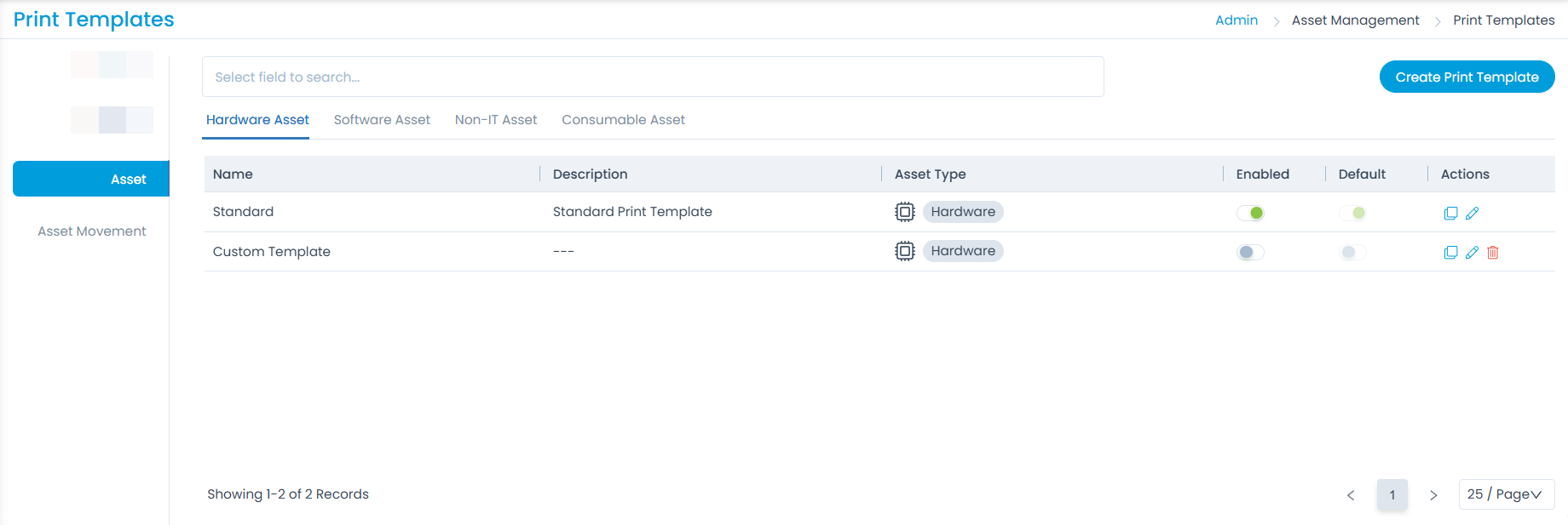To view the Print Templates page, navigate to Admin > Asset Management > Print Templates.