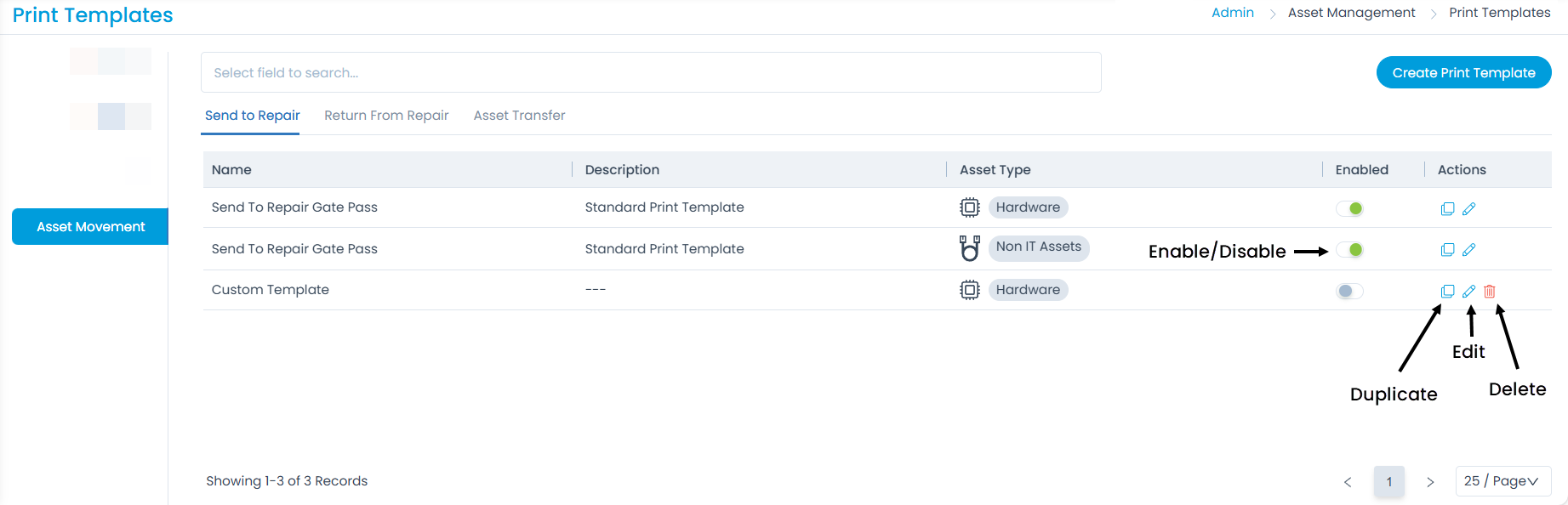 In this tab, you can create and manage templates for asset movement gate passes (Send to Repair, Return from Repair, and Asset Transfer) according to your organizational requirements.