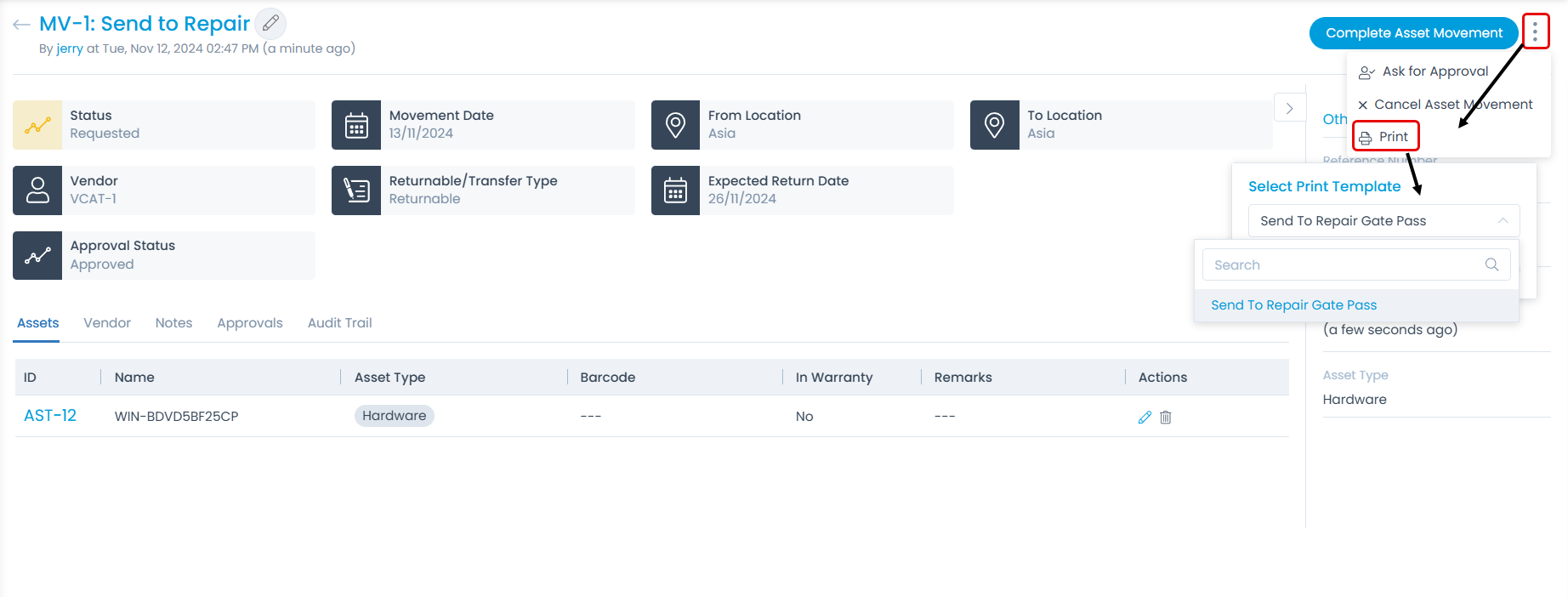 | Asset Movement | Select the type of asset movement. Options include: Send to Repair, Return from Repair, and Asset Transfer. |