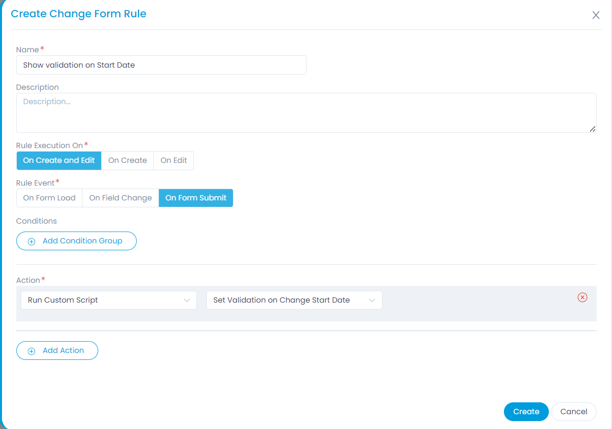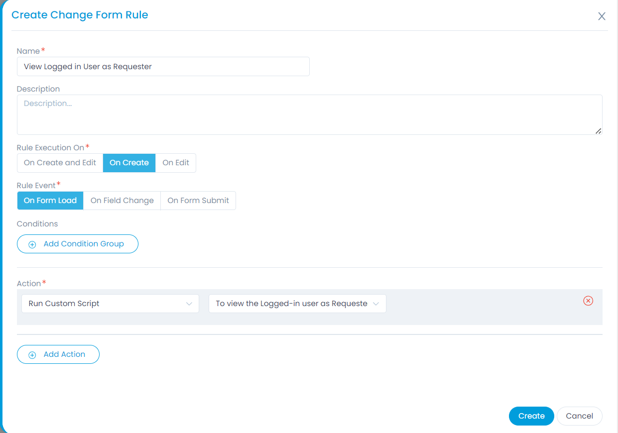 Next, once the script is ready, create a Change Form Rule and apply this script with Rule Execution on "On Create and Edit" and rule Event "On Form Submit".