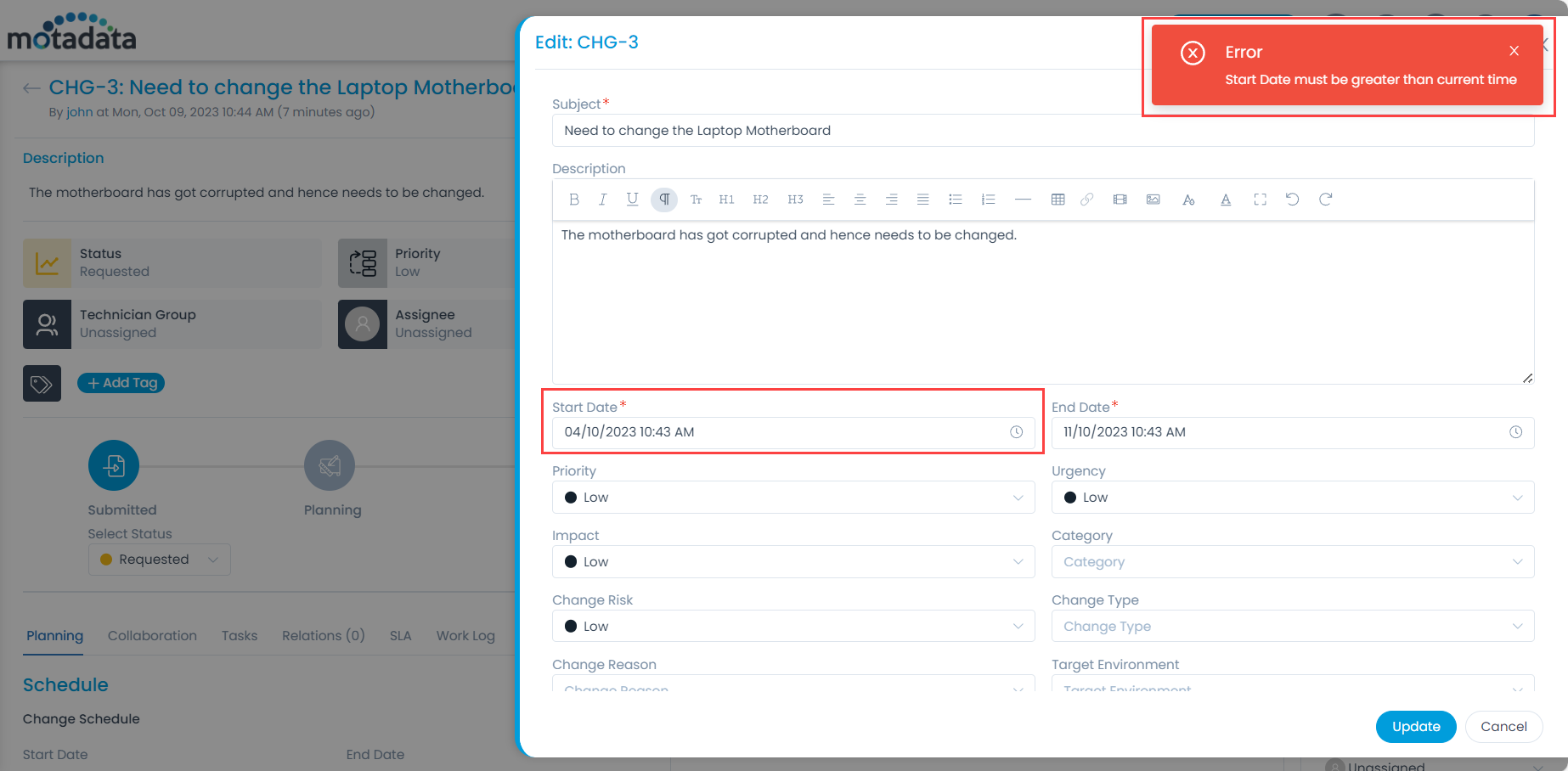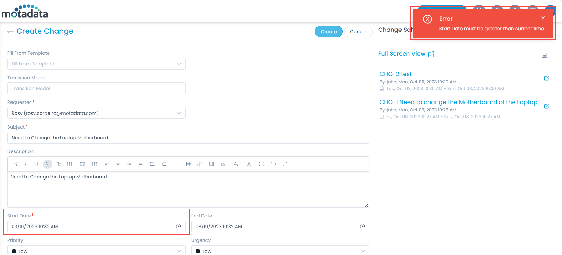 - Once done, create a Change with date less than the Current date, and check the validation appears as shown below.