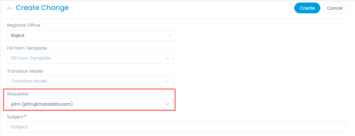 - Once done, on creating a Change Request, you will see the "Requester" field pre-filled with the currently logged-in user's name as shown below.