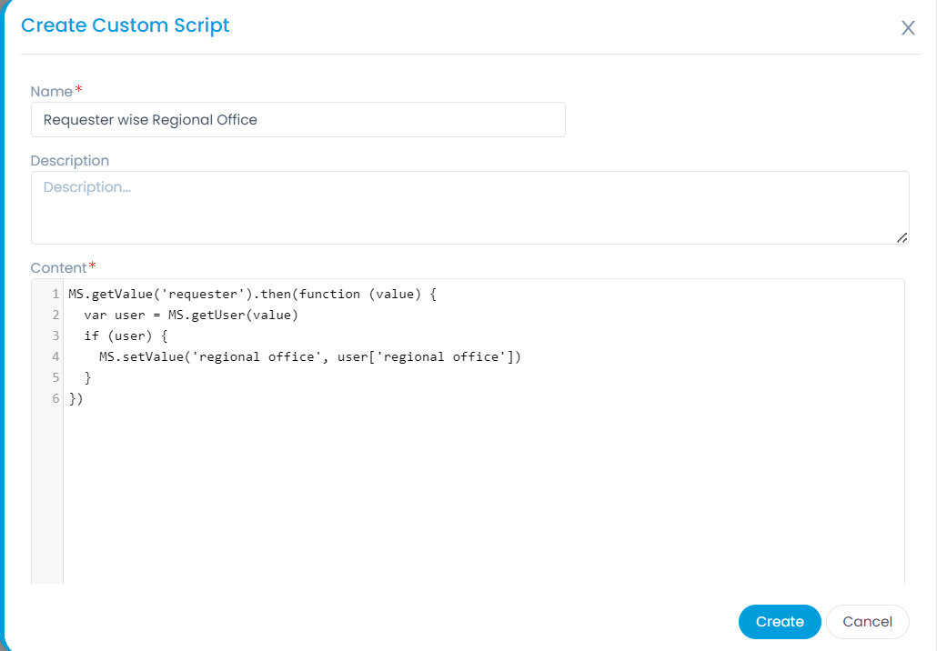 - While creating or editing a Change Request, if you want to display the Requester wise regional office data in the "Regional Office" Custom field, you can use the below script: