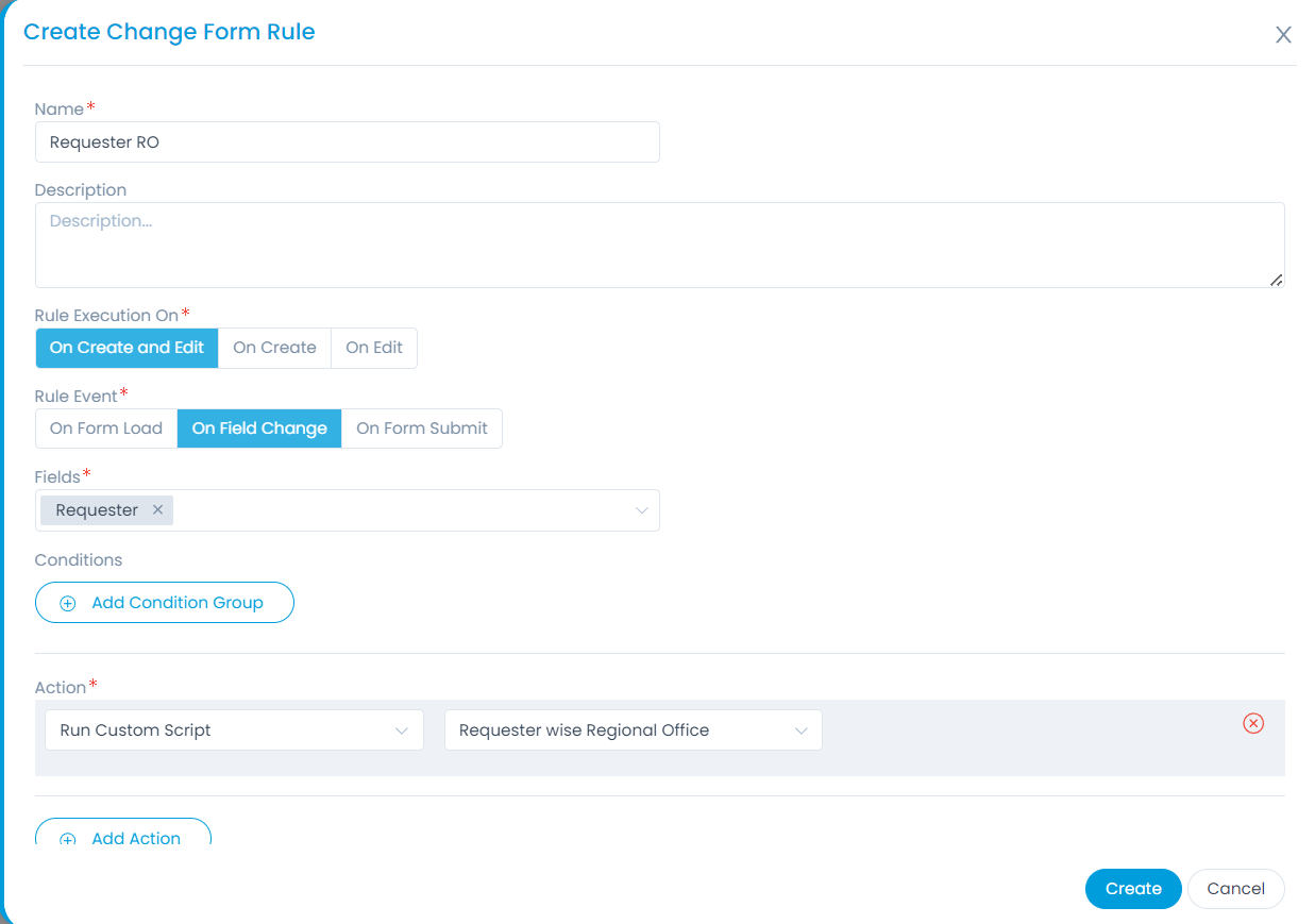 - Create a Change Form Rule as shown below: