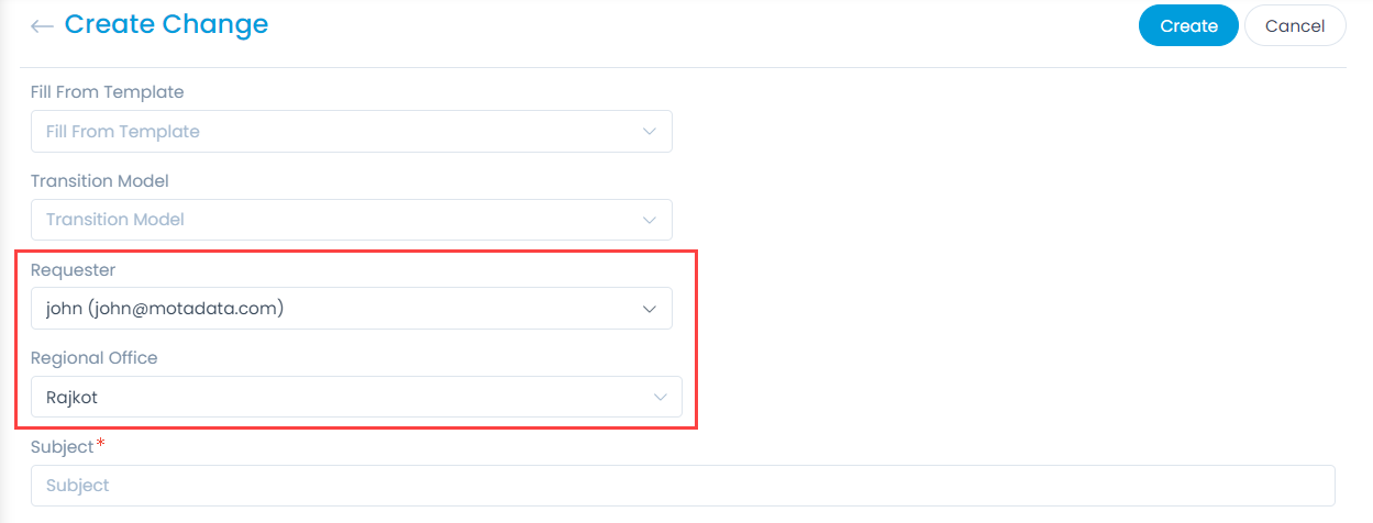 - Once done, while creating or editing the Change Request, on Field Change event the Regional office data will be available based on the selected Requester as shown below.