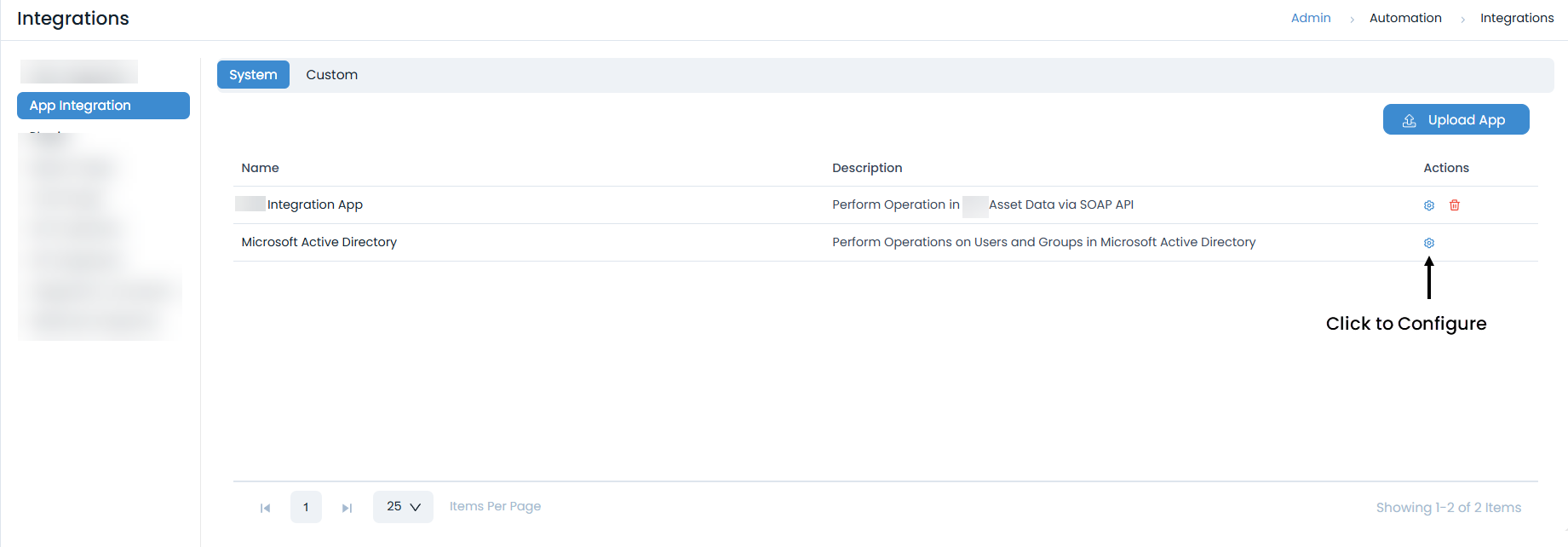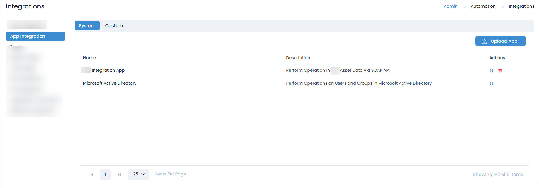 - Click the Admin Settings icon on the top-right corner of the screen and navigate to Automation > Integrations > App Integration tab.