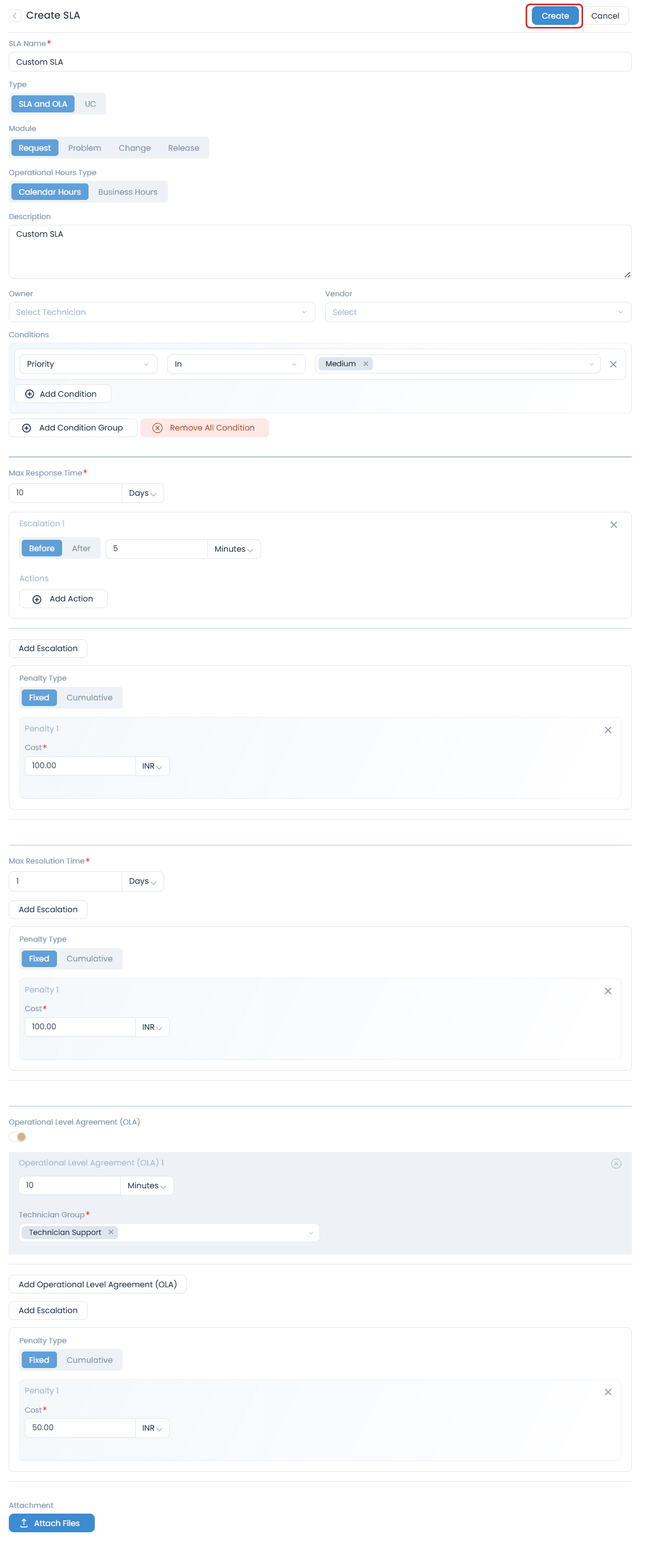 - Along with OLA, you can add Escalation and Penalty to the OLA in the same way as added in Max Response/Resolution Time section.