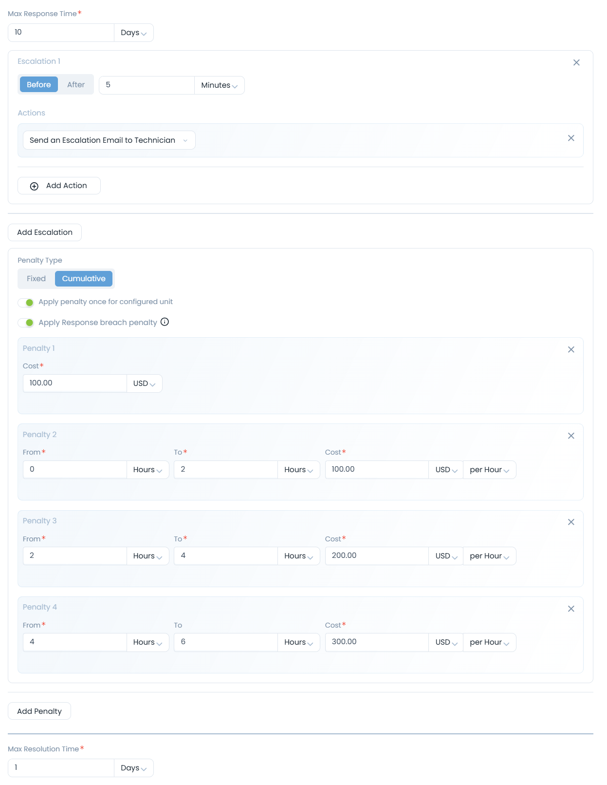 For example, if the below penalties are set for SLA:Penalty 1: From: 0 To: 1 Hours and Cost: 200 USD per Hour