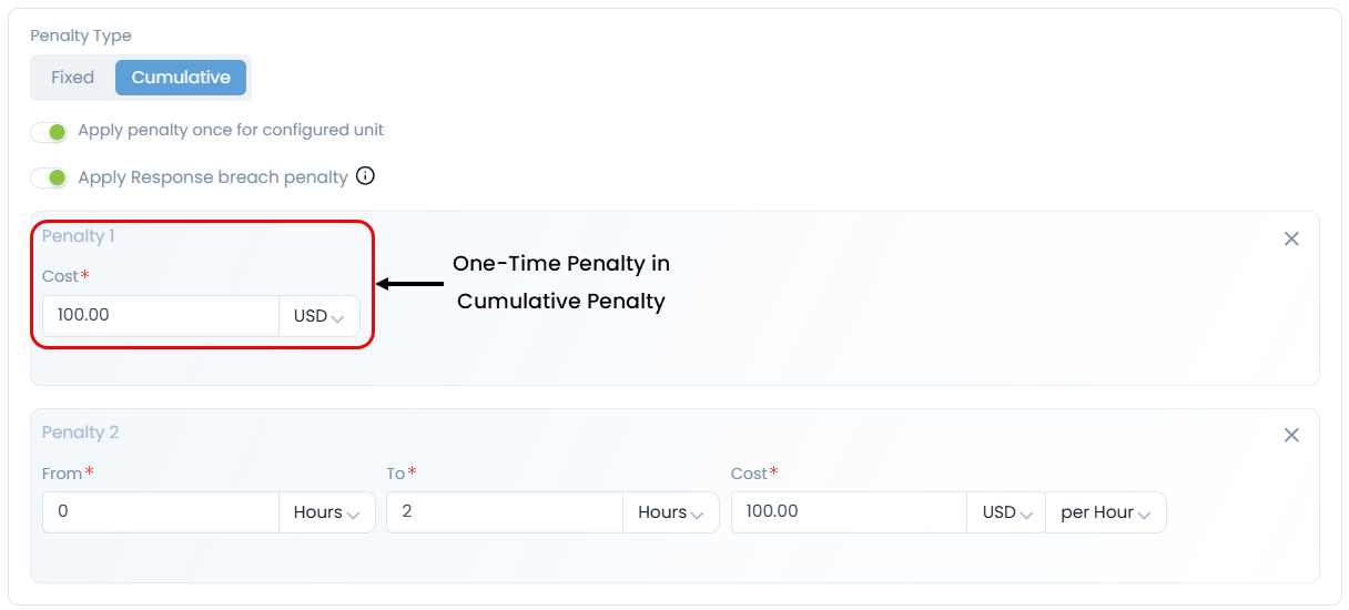 For example, if the one-time penalty is set to 100 USD and the cumulative penalty is defined as 0-2 hours – 100 USD/hour, a 100 USD penalty will be applied immediately upon breaching the SLA, with an additional 200 USD penalty enforced after two hours.