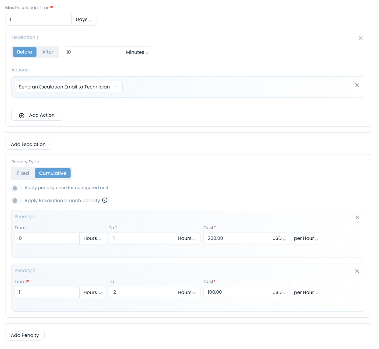 Penalty Type: Select the type of penalty that you want to apply when the SLA is breached for resolving the ticket.