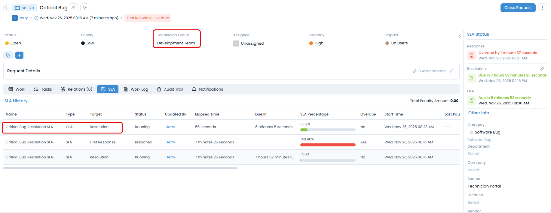 Impact of Technician Group Business Hours: When a Technician Group with specific operational hours (e.g., 24x7) is assigned to the request, the SLA dynamically recalculates the due date. The 15-minute resolution time is then counted based on the technician group's working hours, which adjusts the Overdue Period accordingly for the software installation.