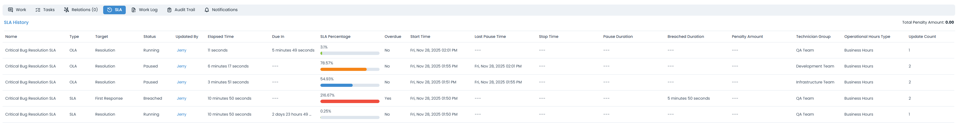Status(e.g.,Running,Paused),Elapsed Time,Due In(if applicable), andSLA Percentage. For instance, the QA Team's OLA shows3.1%SLA Percentage and5 minutes 49 secondsDue In, while the Development and Infrastructure teams' OLAs arePausedwith their respectiveElapsed TimeandSLA Percentage. - Breached SLA for First Response: The history also includes an entry for the main
