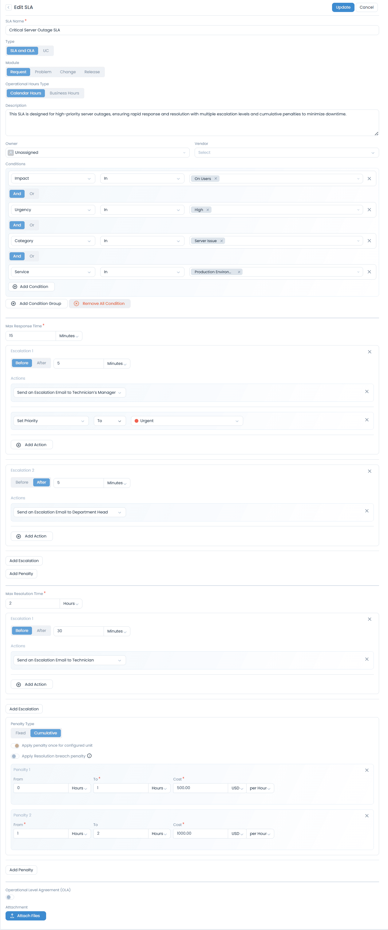 - Description: This SLA is designed for high-priority server outages, ensuring rapid response and resolution with multiple escalation levels and cumulative penalties to minimize downtime.