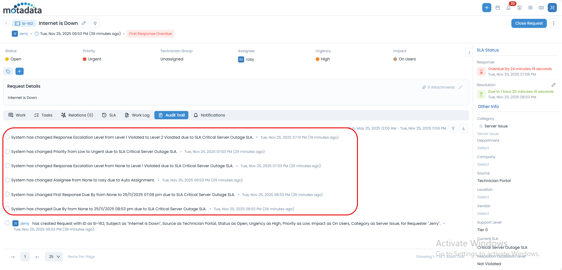 Also, you can view the Audit Trail for the request to see the SLA details as shown below.