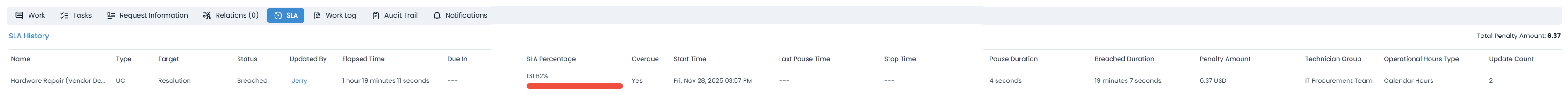 - Description: This SLA is designed for hardware repair requests, ensuring timely vendor engagement and resolution with escalations and penalties.