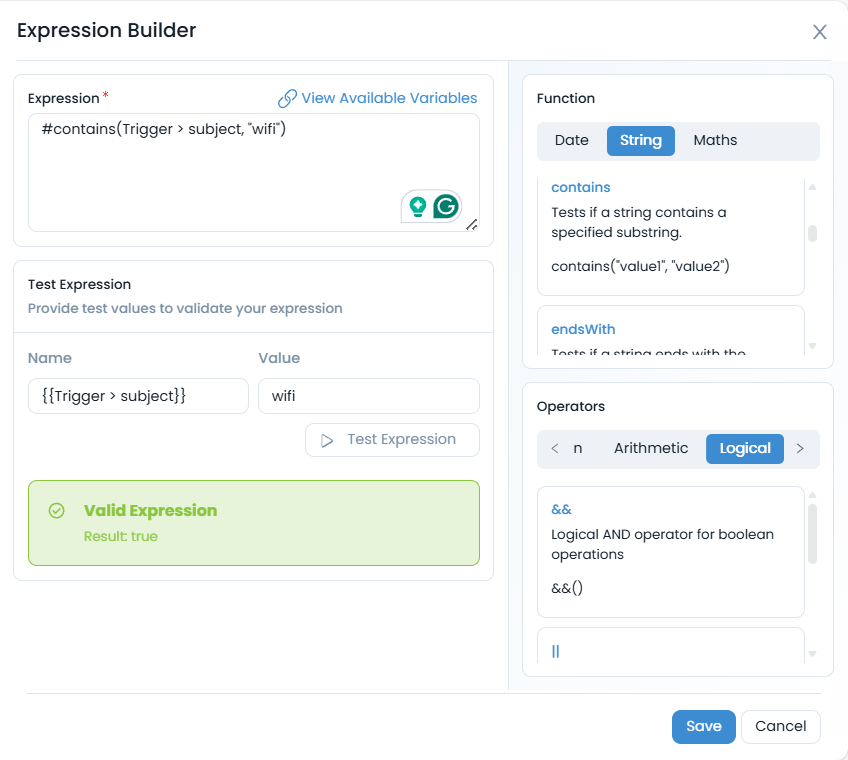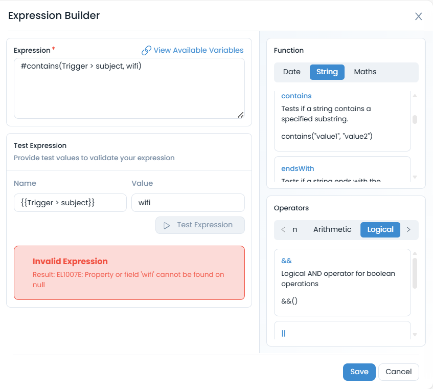 - Preventing Invalid Saves: The system will not allow you to save or proceed with an invalid expression until all errors are resolved. This prevents the deployment of broken automation logic.