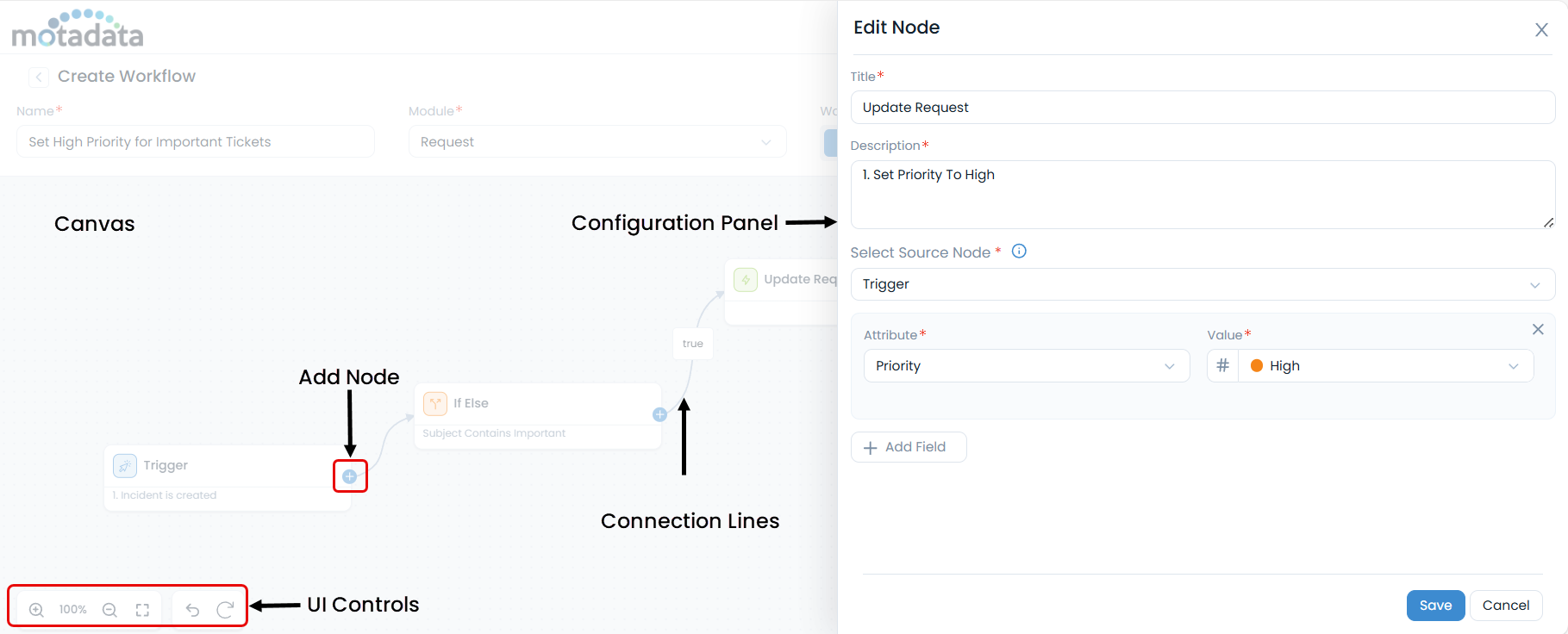 - Add Node Functionality: The flow and action nodes are added to the canvas by clicking an "Add Node" icon. This opens a side-drawer that allows you to select and configure the required node.