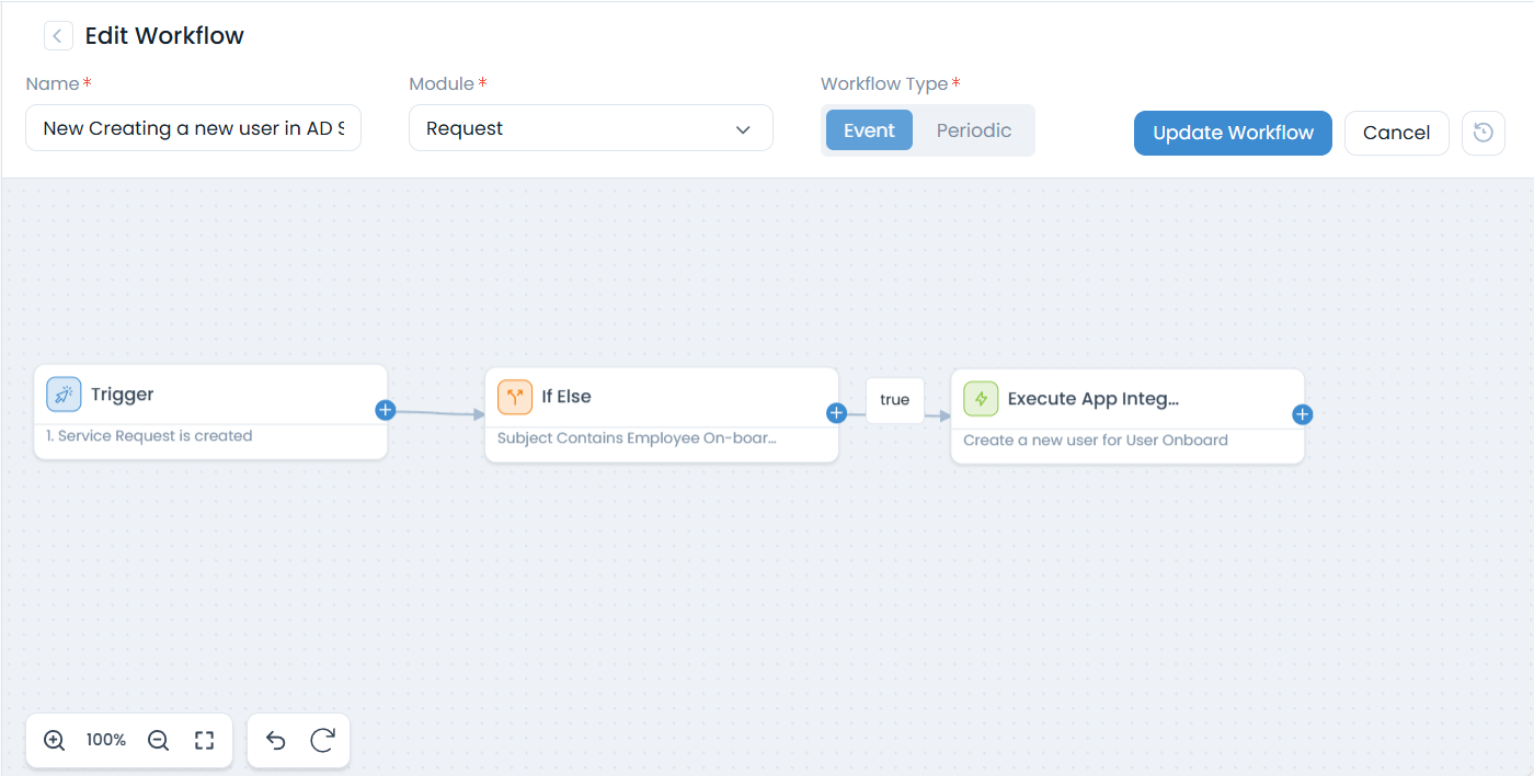 Scenario: When a new employee onboarding request is raised in ServiceOps, a workflow automatically creates a corresponding user account in Microsoft Active Directory. This streamlines the onboarding process and ensures that new employees have immediate access to necessary IT resources.