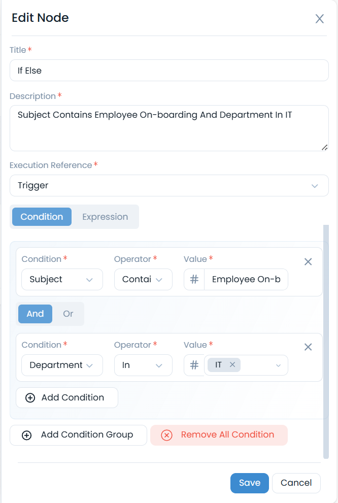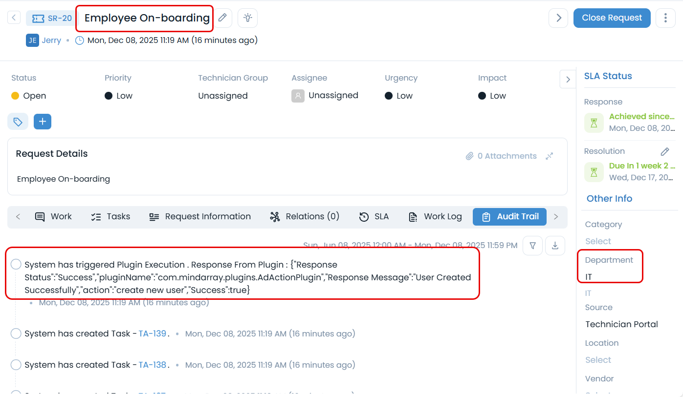 Subjectof the request contains "Employee On-boarding" and theDepartmentis "IT".