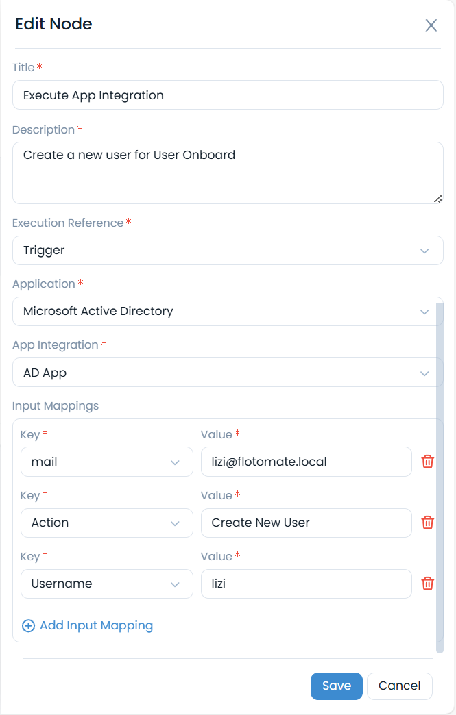 - Input Mappings: Define the key-value pairs to map ServiceOps workflow data to the Active Directory user creation fields.