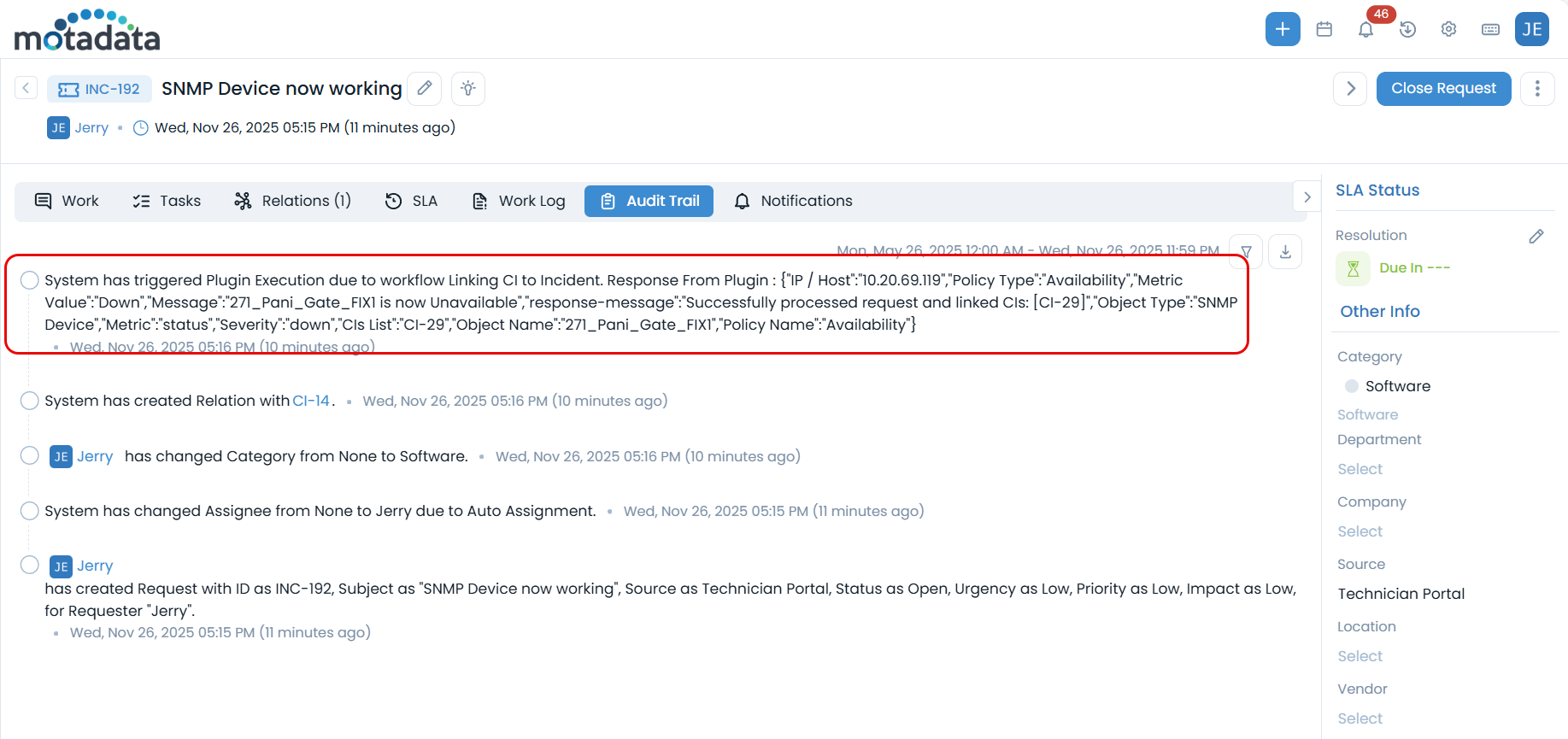 - Check the Relations tab of the incident to confirm that a CI has been automatically linked.
