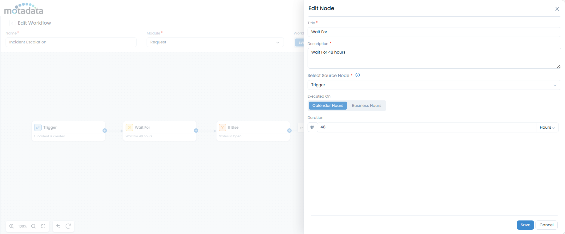 How it Works: When a new incident is created, the workflow starts and immediately encounters the Wait For node, pausing for 48 calendar hours. After the delay, the If/Else node checks the incident's current status. If the status is still 'Open', an escalation email is sent to the manager. If the status has changed, the workflow would follow a different path.
