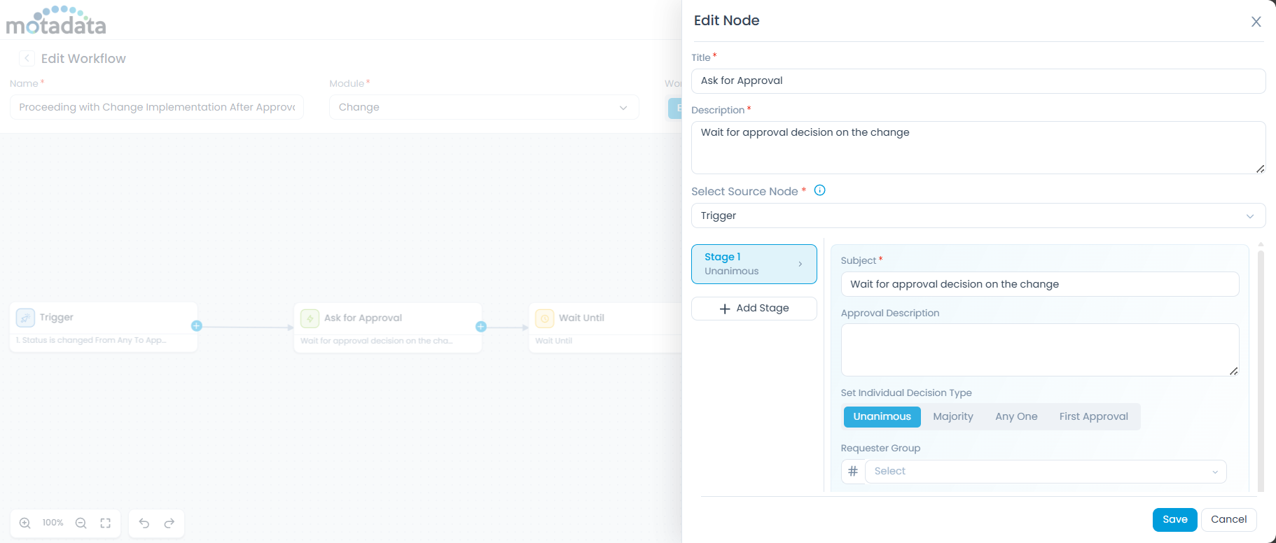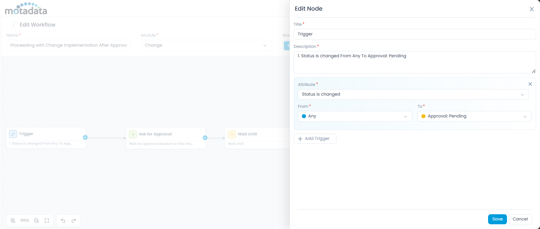 When a change request moves to Approval Pending, the workflow is automatically triggered and sends an approval request using the Ask for Approval node. The workflow then pauses at the Wait Until (Condition) node and continuously evaluates the approval status.