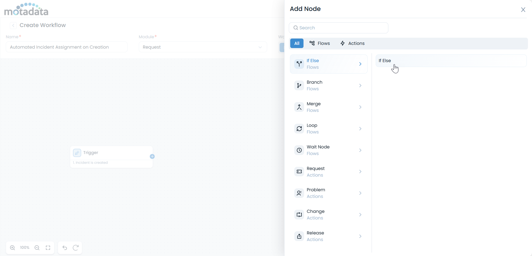 - Flow Node (If/Else): Add an "If/Else" node to evaluate the incident's priority. Set the condition either directly: