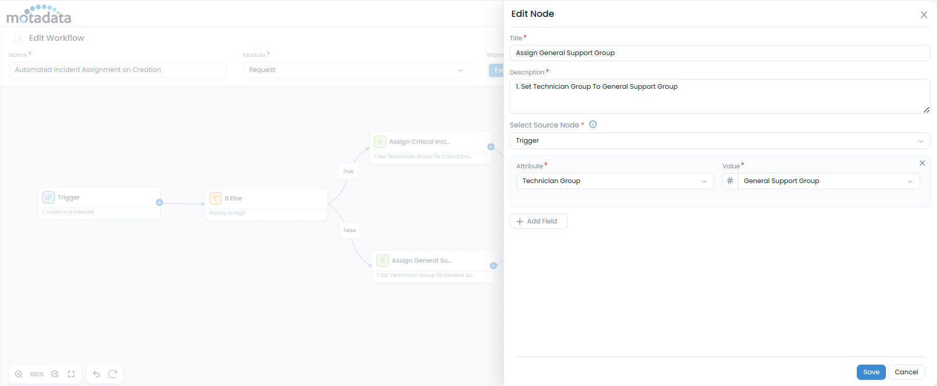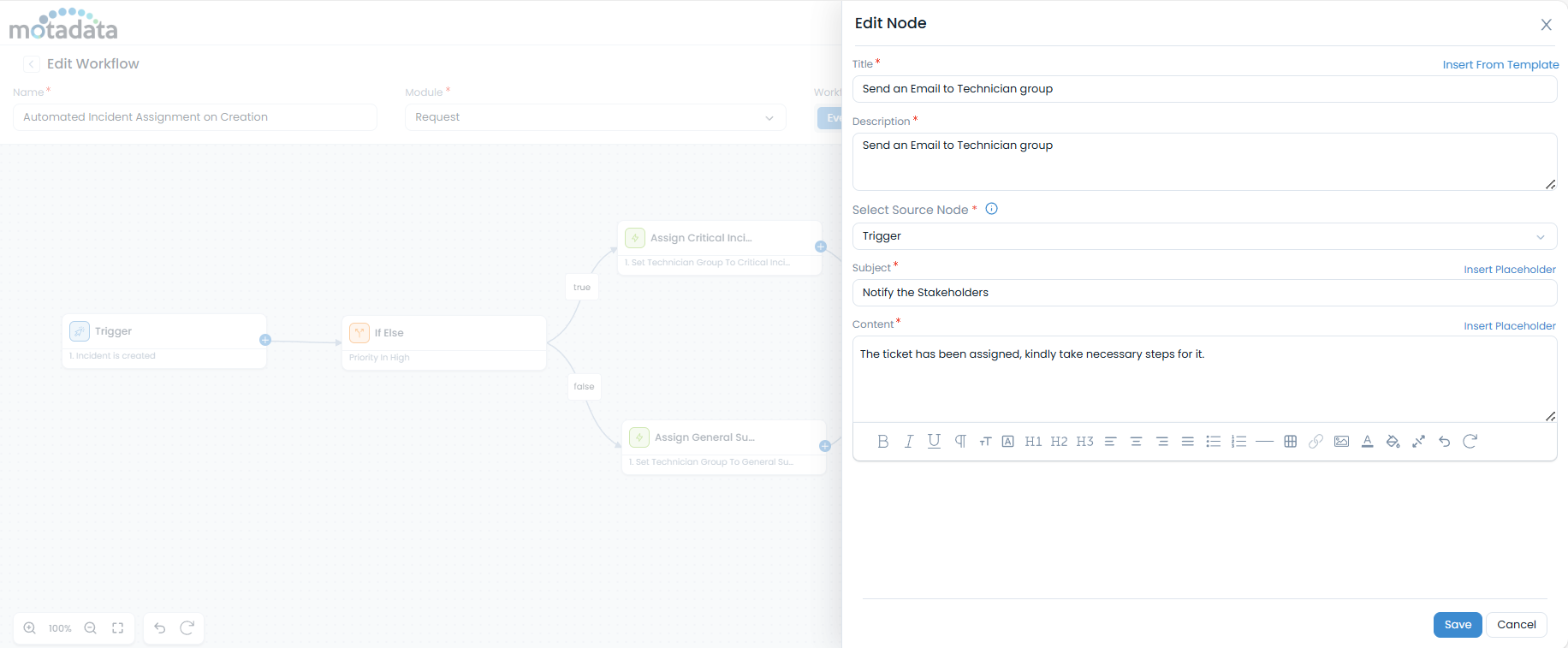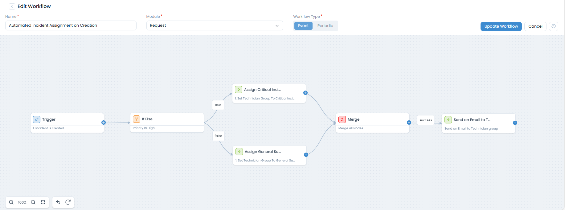 Scenario: Upon the creation of any new incident, the system automatically checks its priority. If the incident is categorized as "High" priority, it is immediately assigned to the "Critical Incident Response" technician group. Incidents of lower priority are routed to the "General Support Group." After either assignment, the workflow merges, and a notification email is dispatched to the relevant technician group to ensure rapid attention and appropriate follow-up.