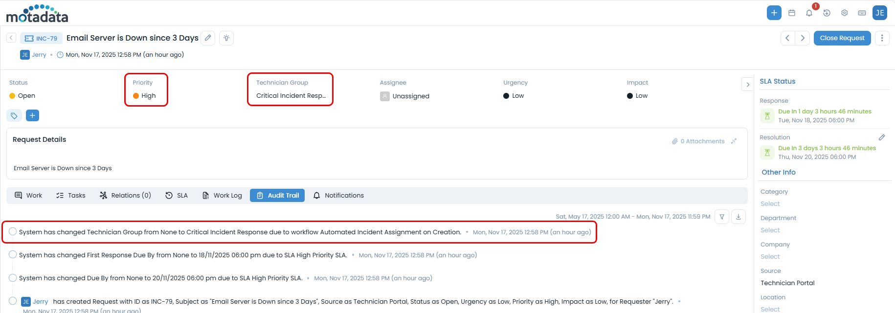 High Priority Incident: When a new incident with High priority is created, it will be assigned to the Critical Incident Response Technician Group, and an email notification will be sent.