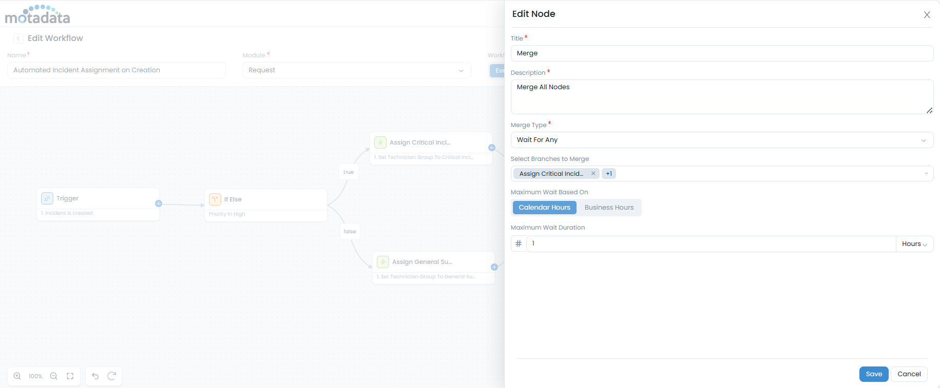 Wait For Any. - Select Branches to Merge: Once the "Assign Critical Incid..." and "Assign General Su..." branches are connected to the Merge node, they will automatically appear in this dropdown.