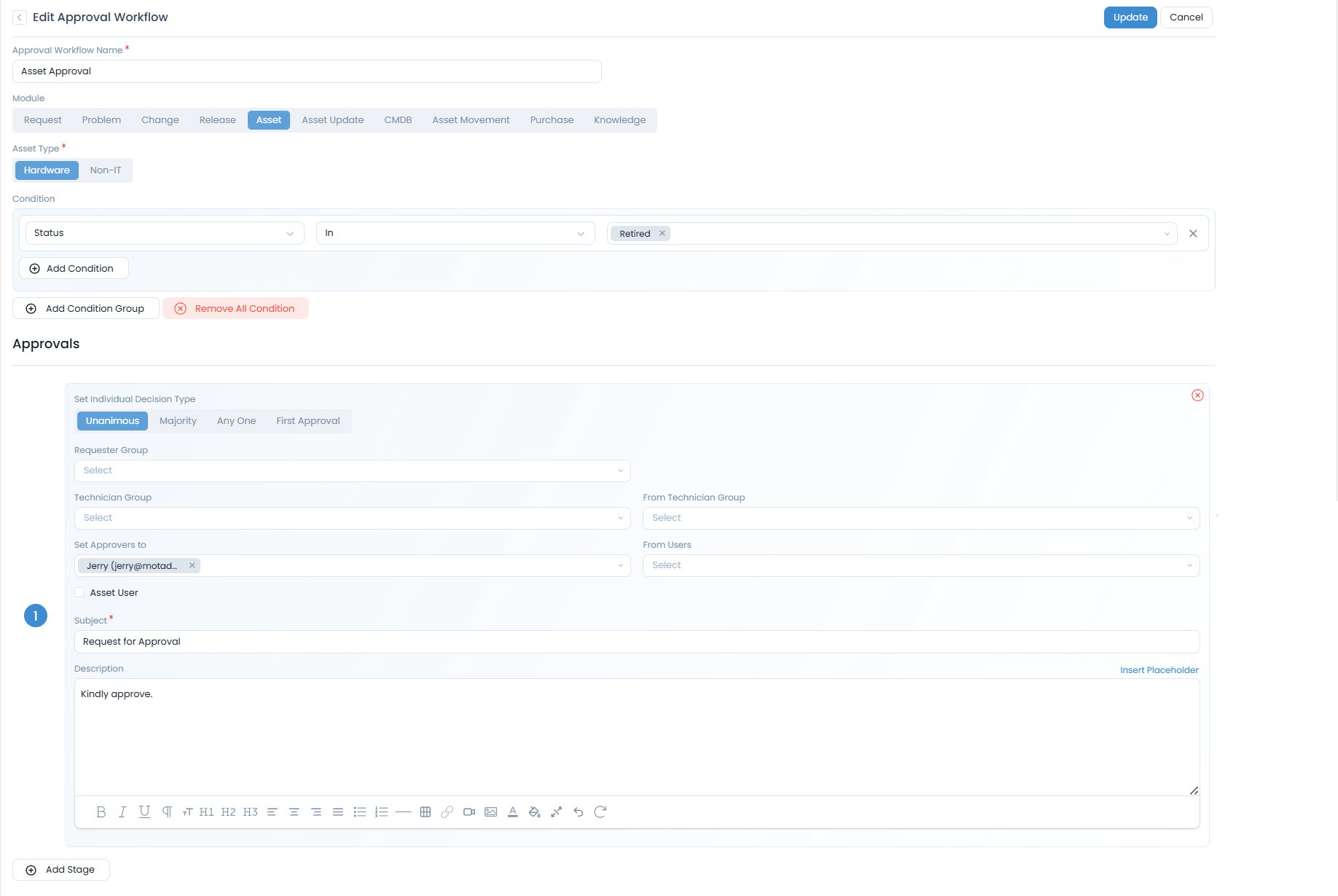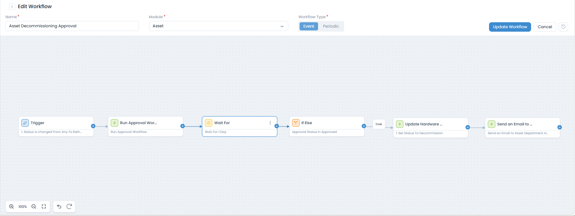 Scenario: When a hardware asset's status is changed to "Retired," this change triggers an approval workflow. The workflow then waits for a specified period (e.g., until a particular date and time) before proceeding to confirm its final decommissioning. If the decommissioning is approved, an email notification is sent to the Asset Department Head.