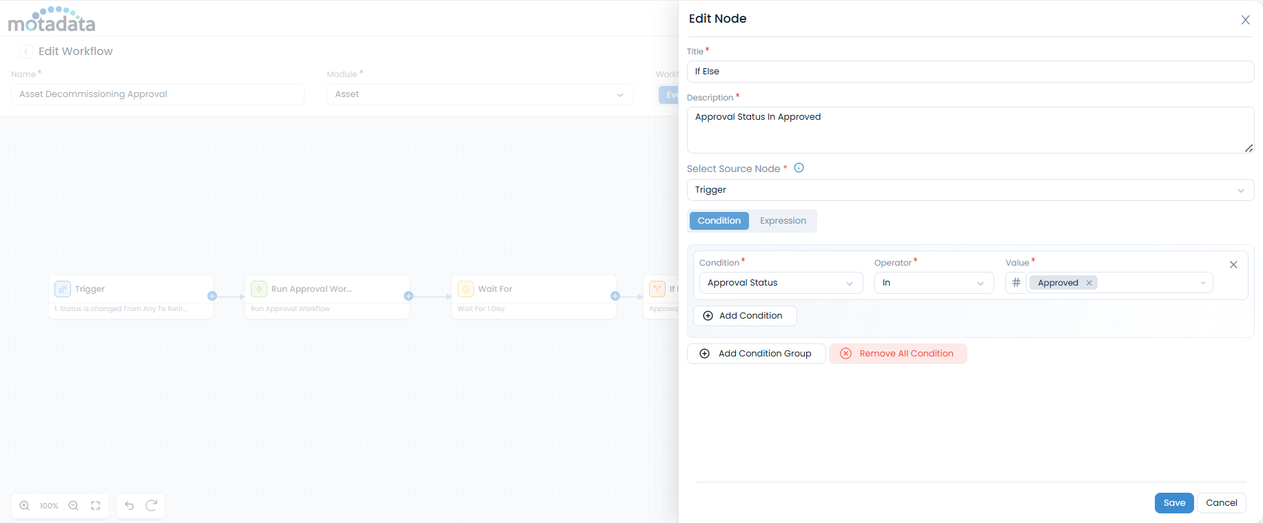 Status is changed From Any To Retired. This initiates the workflow when someone attempts to mark an asset belonging to the asset department same as Asset Department Head as "Retired." - Action Node: Add a "Run Approval Workflow" action, assigning it to the appropriate approver (e.g., Asset Manager, IT Lead). Note, the approver can be set from the Approval Workflow Details page. The Approval Workflow must be configured to run on the Asset module with condition "Status is changed From Any To Retired" as shown below: