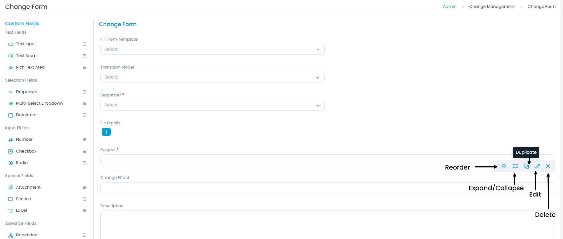 - Custom Fields: These are additional fields that can be added to the change form from the Field Pallet. Custom fields provide flexibility to meet specific organizational needs. They can be renamed, modified, and deleted as required.