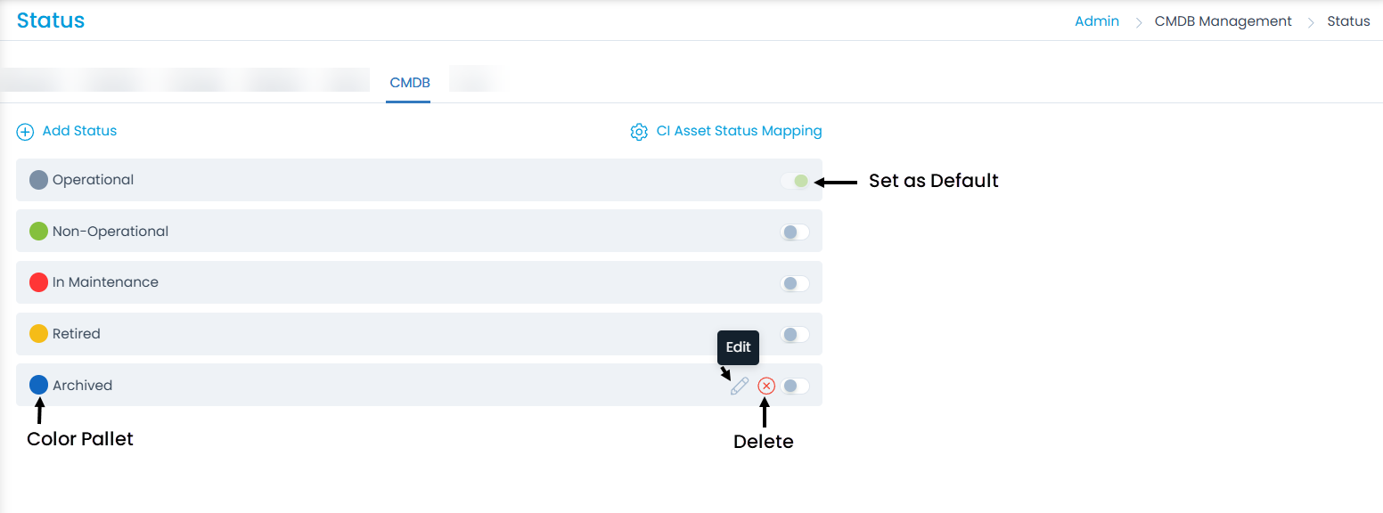 To view the CI Status page, navigate to Admin > CMDB > CI Status > CMDB tab.