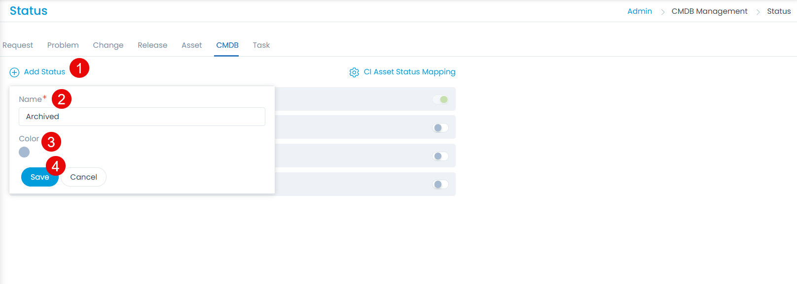 Here, you can manage the status of the tickets and map the CI status values with the Asset status. Also, you can edit the status names, set the default status, and change the color of the status values as per the organization’s theme.