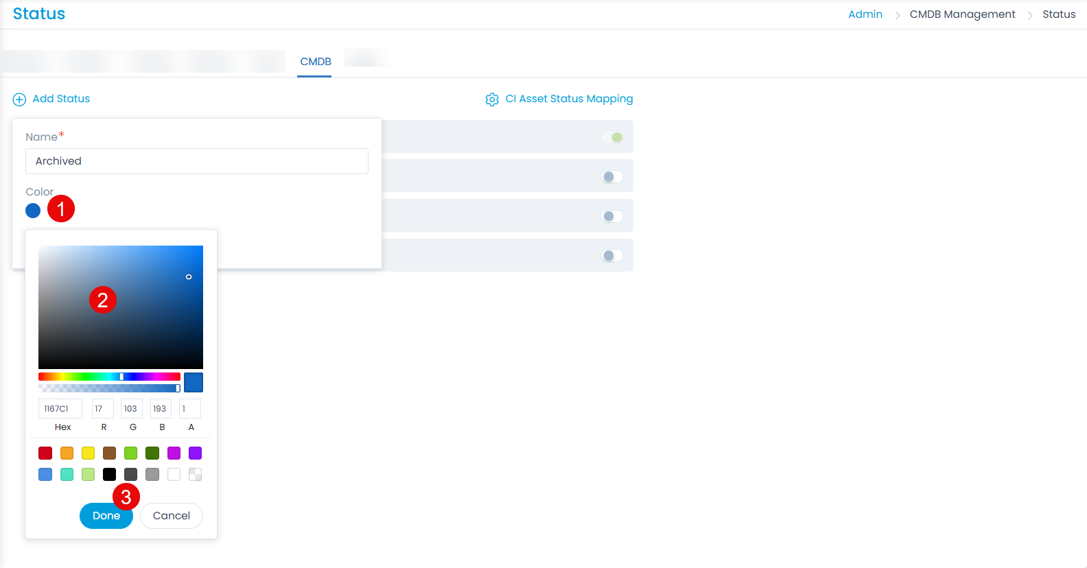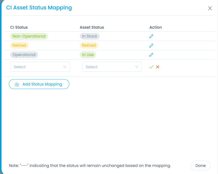 This enables to map the CI status values with the Asset status. You can also map the custom statuses.