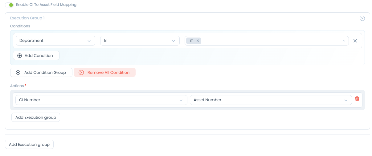 - Enable CI to Asset Field Mapping: Enable to map the CI custom fields with the Asset custom fields based on the condition groups. A maximum of 5 condition groups can be created. For example, if the Department of CI is IT, the custom field "CI Number" will be mapped to the "Asset Number" custom field as shown below.