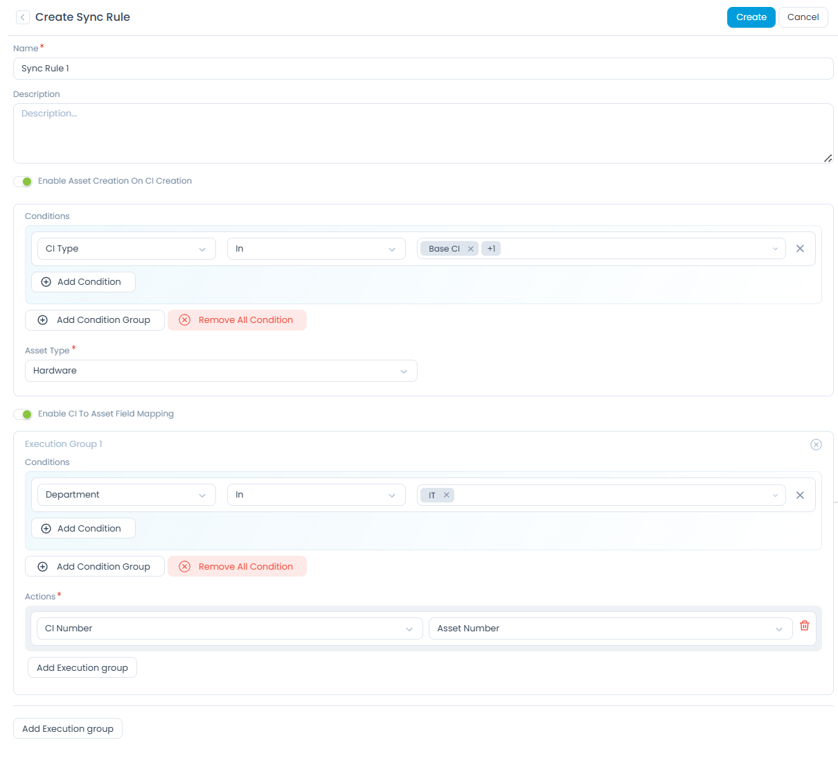 - Sync Rule: Enables you to create rules to synchronize the Configuration Items with Assets.