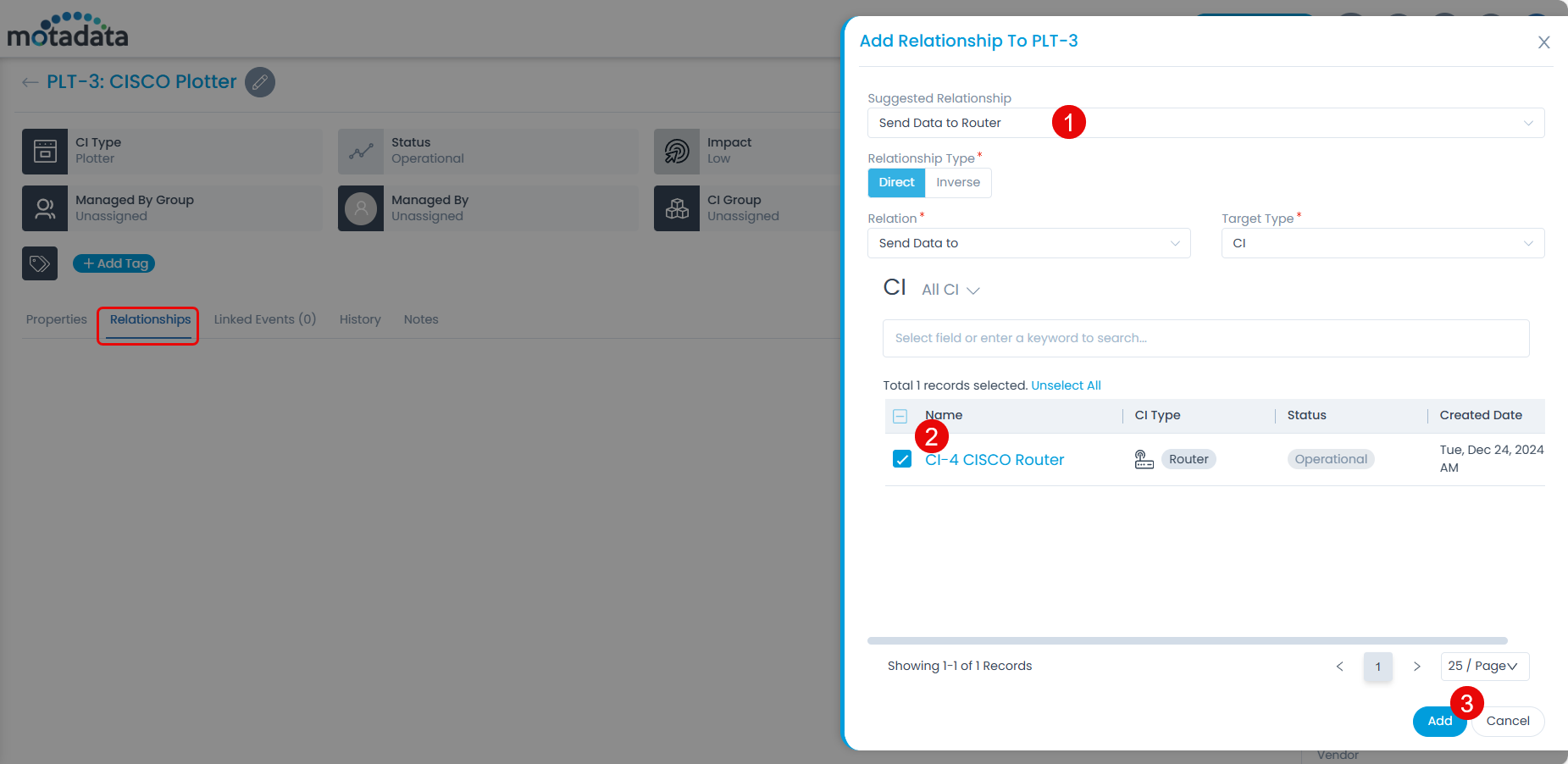 - You can now use this suggested relationship while creating relationship from the respective CI details page as shown below.