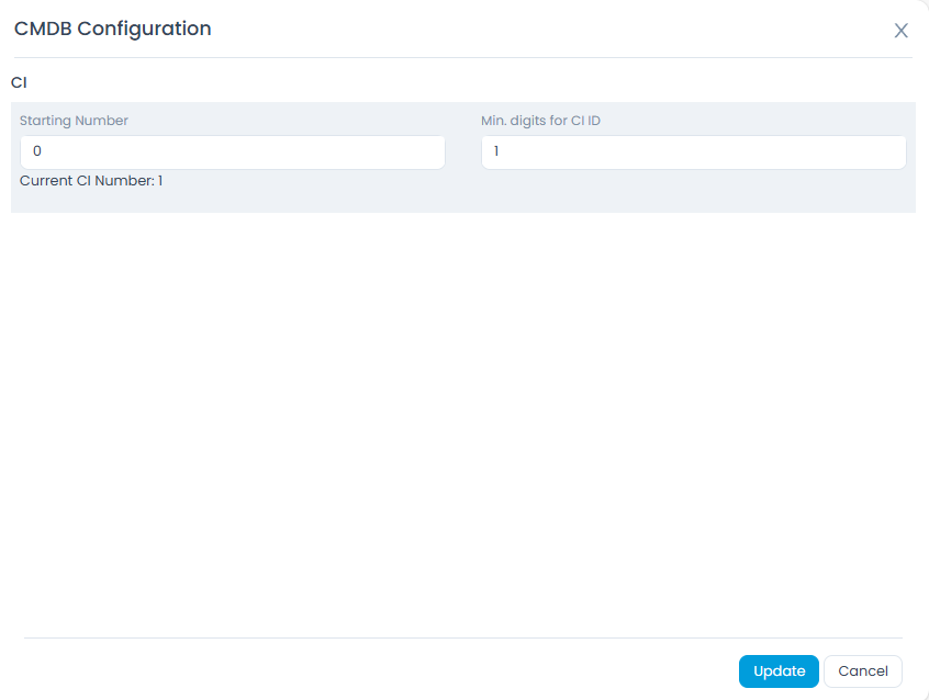 Here, you can configure the starting number and minimum required digits for the CI ID of the configuration item.