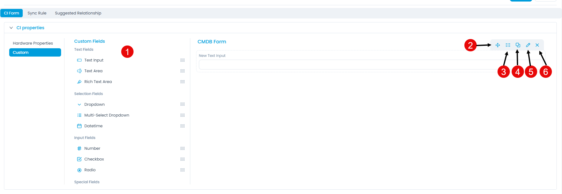 - CI Form: Enables you to design the form by adding new custom fields in the properties of the CI type and in the sub CI type form itself.
