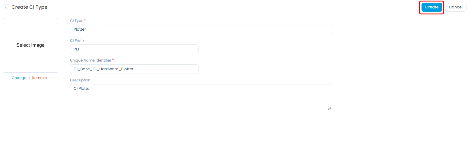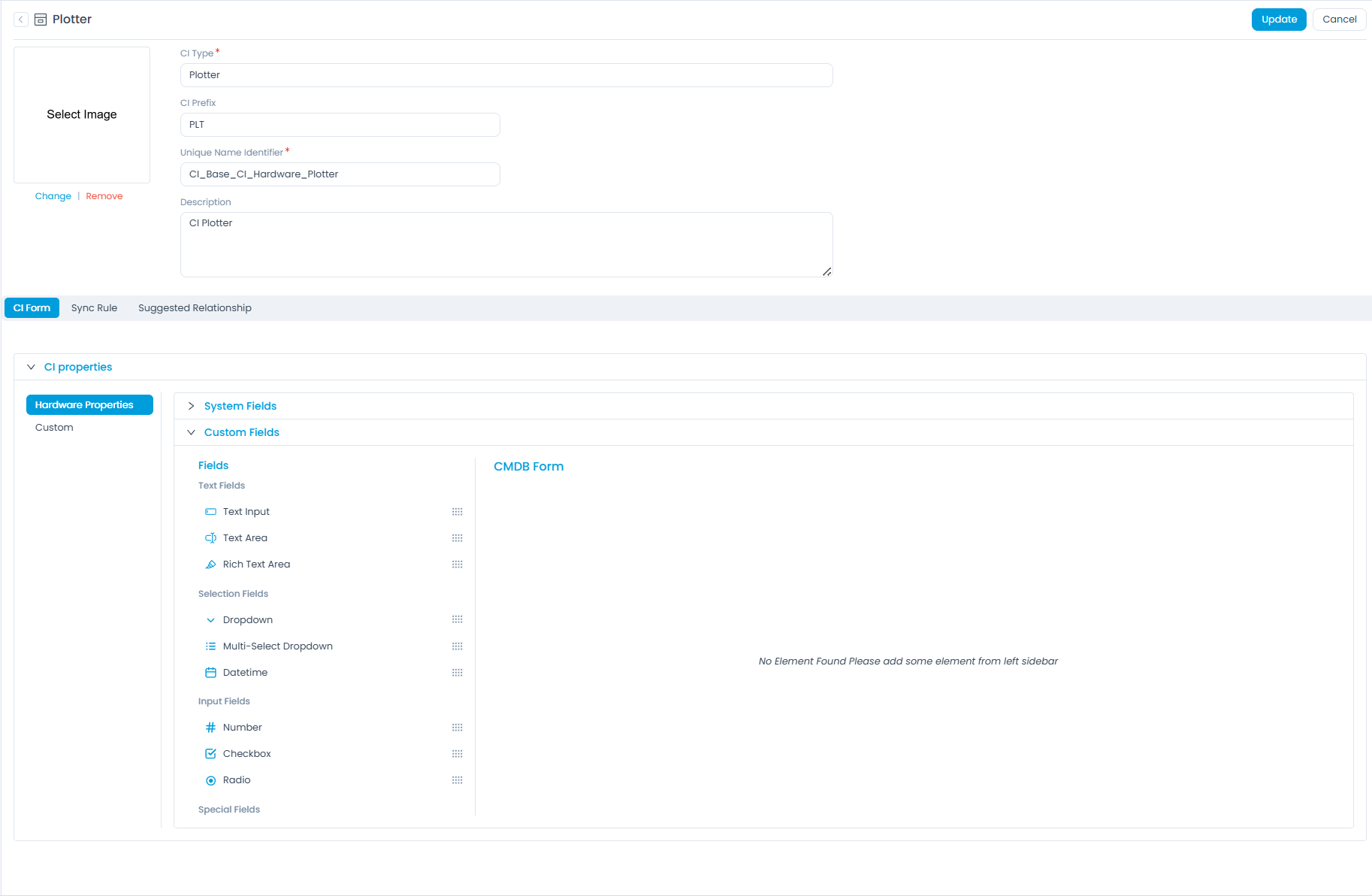 Additionally, you can add custom fields in the form of this particular CI Type (Plotter) as shown below.