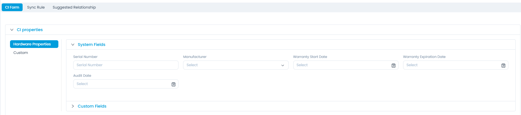 CI form enables you to view the system fields of the properties and add custom fields either to the properties or to the CI type form.