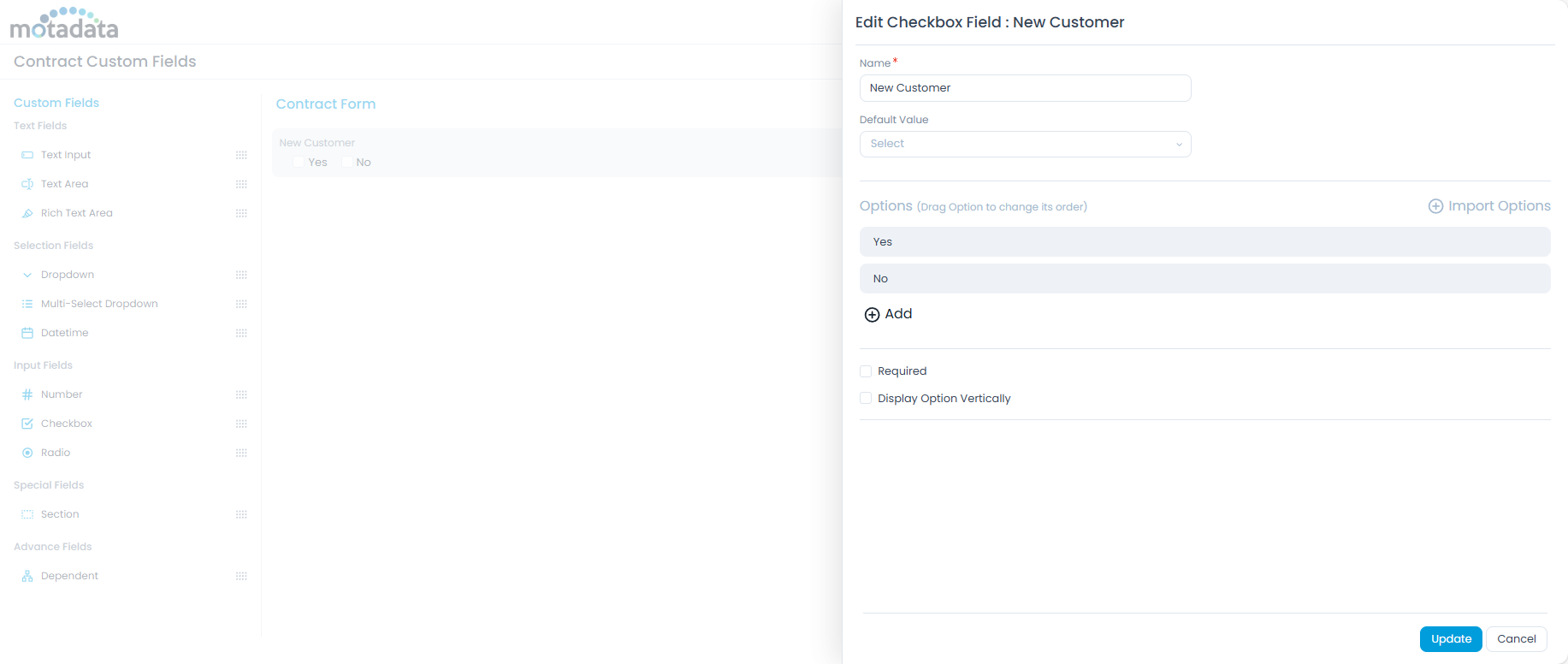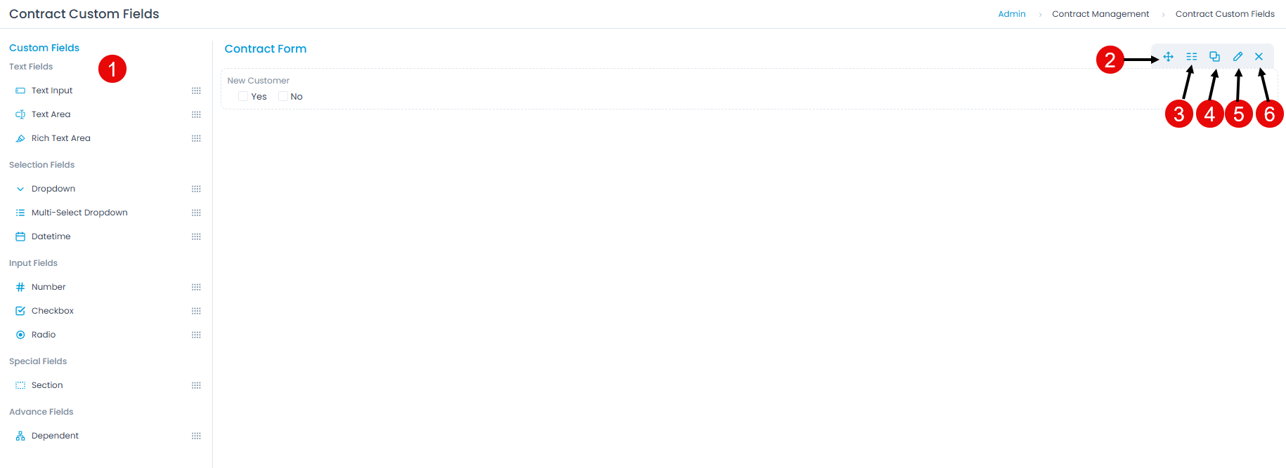 - Custom Fields: These are additional fields that can be added to the contract form from the Field Pallet. Custom fields provide flexibility to meet specific organizational needs. They can be renamed, modified, and deleted as required.