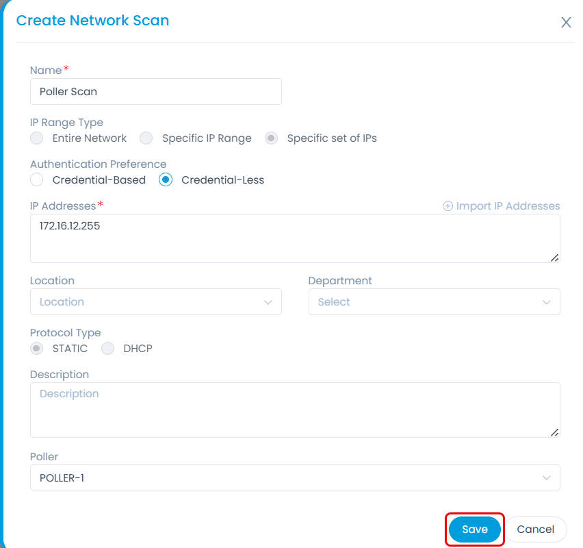 - Department: Select the department of network scan. It is optional.
